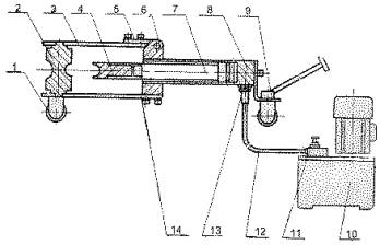 由電動(dòng)油泵(10),高壓油管(12),快速接頭(13),工作油缸(8),柱塞(7),彎管部件[包括上花板(3),下花板(14),模頭(4),輥軸(2)]組成。由電動(dòng)油泵輸出的高壓油,經(jīng)高壓油管送入工作油缸內(nèi),高壓油推動(dòng)工作油缸內(nèi)柱塞,產(chǎn)生推力,通過(guò)彎管部件彎曲管子 。