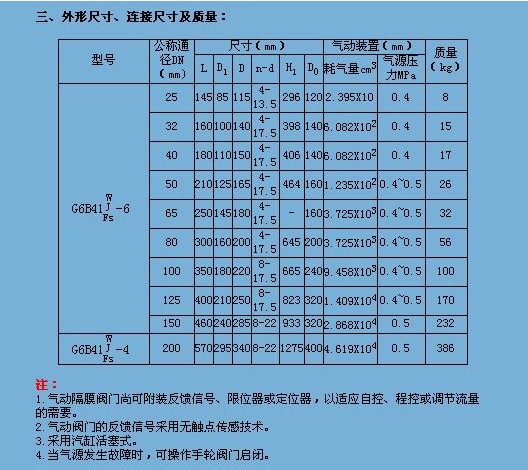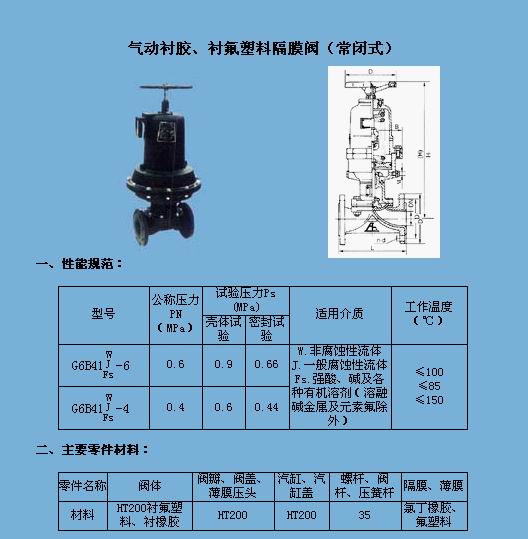 最突出特點是隔膜把下部閥體內腔與上部閥蓋內腔隔開,使位于隔膜上方的閥桿、閥瓣等零件不受介質腐化,省往了填料密封結構,且不會產生介質外漏。1、采用橡膠或塑料等軟質密封制作的隔膜,密封性較好。由于隔膜為易損件,應視介質特征而定期調換。 2、受隔膜材料限制,隔膜閥實用于低壓和溫度相對不高的場合。 3、隔膜閥按結構情勢可分為:屋式隔膜閥、直流式隔膜閥、截止式隔膜閥、直通式隔膜閥、閘板式隔膜閥和直角式隔膜閥六種;連接情勢通常為法蘭連接;按驅動方法可分為手動、電動和睦動三種,其中氣動驅動又分為常開式、常閉式和往復式三種。氣動襯膠隔膜閥 (常閉式)性能規(guī)范