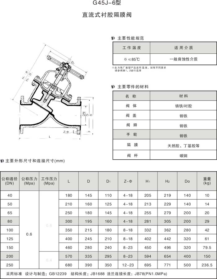 直流式隔膜閥型號(hào): G45J 口徑:15~200MM 壓力:0.6~2.5Mpa 溫度:≤150℃ 材料:碳鋼、鑄鐵BE、RPP、PVDF、PVC、ETFE 設(shè)計(jì)尺度:JB、GB、ANSI、BS、API、ISO、DIN、NF