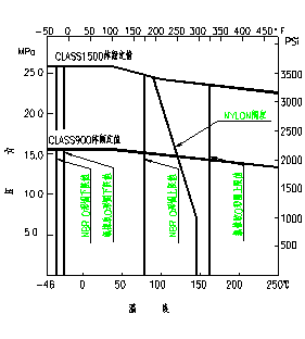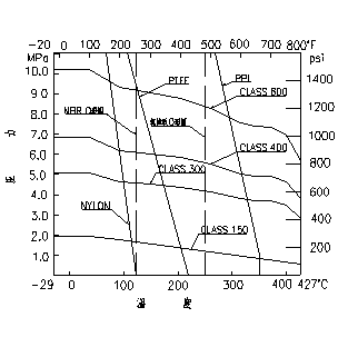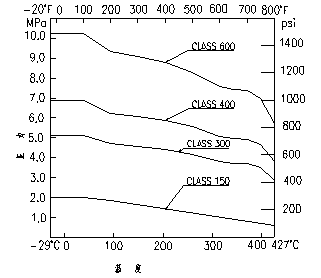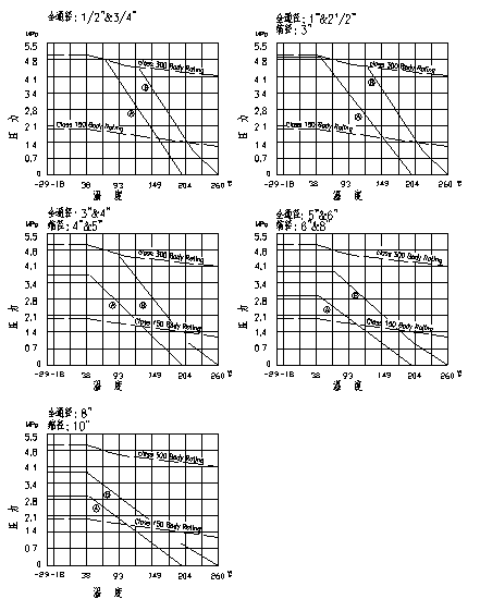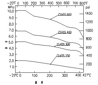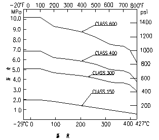 注:圖為WCB材料在CLASS150、300、400、600壓力等級(jí)下的壓力溫度額定值。其他壓力等級(jí)和其他材料的壓力溫度額定值請(qǐng)查ASME B16.34