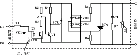 固態(tài)繼電器由三部分組成:輸進(jìn)電路、隔離(耦合)和輸出電路,在輸進(jìn)電路把持端參加信號(hào)后,IC1光電耦合器內(nèi)光敏三極管呈導(dǎo)通狀態(tài),R1串接電阻對(duì)輸進(jìn)信號(hào)進(jìn)行限流,以保證光耦合器不致?lián)p壞。發(fā)光二極管LED唆使輸進(jìn)端把持信號(hào),二級(jí)管VD1可防止輸進(jìn)信號(hào)正負(fù)極性接反時(shí)對(duì)光耦I(lǐng)C1造成的損壞。