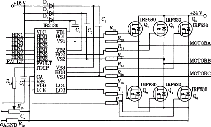 設(shè)計(jì)中,伺服電機(jī)是三相異步電動(dòng)機(jī),驅(qū)動(dòng)芯片選用電動(dòng)機(jī)把持專用芯片IR2130,如圖2所示。它帶有3個(gè)獨(dú)立的高壓側(cè)和低壓側(cè)輸出通道,可輸出6路驅(qū)動(dòng)脈沖,只需1個(gè)直流工作電源,工作頻率可達(dá)kHz。邏輯輸進(jìn)與CMOS或LSTTL輸出兼容,最小可達(dá)到15V邏輯電壓。外圍電路中的參考地運(yùn)行放大器通過(guò)外部的電流檢測(cè)電位器供給全橋電路電的模仿反饋值,假如超出設(shè)定或調(diào)劑的參考電流值,IR2130驅(qū)動(dòng)器的內(nèi)部電流保護(hù)電路就啟動(dòng)關(guān)斷輸出通道,實(shí)現(xiàn)電流保護(hù)功效。浮動(dòng)通道能夠用來(lái)驅(qū)動(dòng)N溝道功率MOSFET和IGBT,最高電壓可達(dá)到600V。功率器件選用IRF630型功率放大器,最大工作電流42A,最大工作電壓100V,具有高效性和高可靠性。