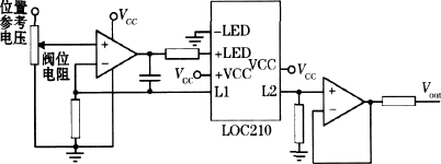 設(shè)計(jì)的地位檢測(cè)元件是一個(gè)結(jié)構(gòu)簡(jiǎn)略、精度高、可靠性高的導(dǎo)電塑料電位器,將履行機(jī)構(gòu)的直線或角位移轉(zhuǎn)換為電阻信號(hào)。如圖3所示,采用LOC210模仿線性光隔將采集來(lái)的信號(hào)
