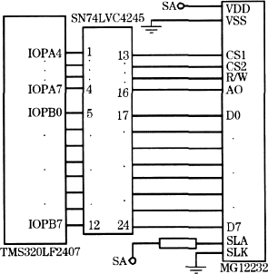 圖5中,SLA為背光電源,SLK為背光電源地,D0~D7為8位數(shù)據(jù)線,AO為寫進(jìn)數(shù)據(jù)/寫進(jìn)命令字選擇端口,R/W為讀寫選擇端,CS1、CS2為液晶顯示屏邊選擇信號(hào),VDD為邏輯電源正端,VSS為邏輯電源負(fù)端。由于DSP的邏輯電源為313V,而液晶顯示模塊的邏輯電源為5V,所以采用SN74LVC4245作為連接DSP與液晶顯示模塊的中間環(huán)節(jié),起到電平轉(zhuǎn)換的作用。