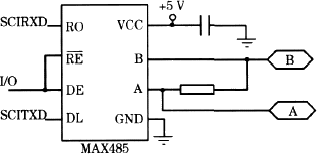 采用RS-485接口,利用MAX485作為TMS320LF2407的接口驅(qū)動(dòng)芯片,電路圖見(jiàn)圖6。由于RS-485為半雙工通信結(jié)構(gòu),因此用一個(gè)I/O口來(lái)把持器件處于接收或發(fā)送狀態(tài)。