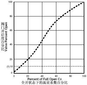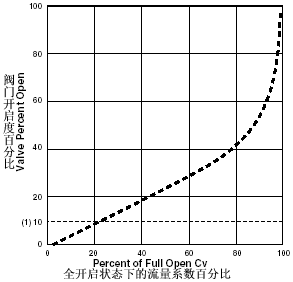 查詢圖2,全開狀態(tài)的1/4時閥門的比率是52%.