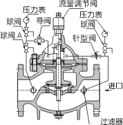 當(dāng)閥門從進口端給水時,水流過針閥進進主閥把持室,并經(jīng)過導(dǎo)閥、球閥流出主閥把持室到出口,此時主閥處于全開或浮動狀態(tài)。調(diào)定主閥上部的流量調(diào)節(jié)閥,可為主閥設(shè)定必定開度。調(diào)節(jié)針閥開度和調(diào)節(jié)導(dǎo)閥彈簧壓力,即可使主閥開度保持在設(shè)定開度,并在壓力變更時導(dǎo)閥進行主動調(diào)節(jié),保持流量不變。