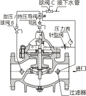 1、作泄壓閥:當(dāng)泄壓/持壓導(dǎo)閥調(diào)劑為泄壓狀態(tài)時,水通過針閥、主閥把持室、球閥A、泄壓/持壓導(dǎo)閥、球閥B流向出口,此時主閥處于開啟狀態(tài)。當(dāng)進(jìn)口壓力超過泄壓/持壓導(dǎo)閥設(shè)定的安全值時,泄壓導(dǎo)閥會主動開啟,通過球閥C放出部分水,使管路泄壓。當(dāng)壓力恢復(fù)到安全值時,泄壓閥主動封閉。作泄壓閥時,各球閥常開。