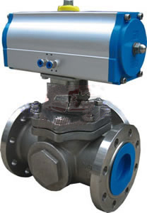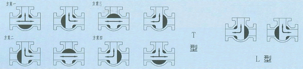 氣動三通球閥分L型和T型,介質(zhì)流通方向見下圖。L型三通球閥實用于介質(zhì)流向的切換,能使相互垂直的兩個通道連通:T型三通球閥實用于介質(zhì)的分流、合流或流向切換,T型孔道可以使三個通道互相連通或使其中兩個通道連通,三通球閥一般采用兩個閥座結(jié)構(gòu),亦可根據(jù)用戶請求采用四閥座結(jié)構(gòu)。