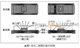 LED芯片本身也有很多種類,依照封裝組立方式的不同,LED芯片的結(jié)構(gòu)也截然不同。此外LED芯片的尺寸必須根據(jù)使用電力選擇。圖1(a)是銅凸塊(Bump)方式,使用覆晶(Flip Chip Type)LED的斷面結(jié)構(gòu)圖。LED的特性取決于LED芯片的發(fā)光性能、封裝后的取光效率、集光技術(shù),因此芯片的高輝度化、封裝的高性能化、芯片與封裝的組合排名推廣設(shè)計都非常重要。