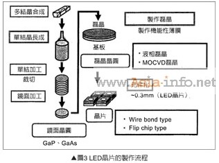 圖3是從結(jié)晶基板一直到LED芯片的制作流程,如圖所示GaP多結(jié)晶使高純度鎵(Ga)與磷(P)原料,在高溫、高壓環(huán)境下反應(yīng)形成GaP多結(jié)晶,接著將此高純度多結(jié)晶的原料,在高溫、高壓環(huán)境下溶解,與種晶接觸的同時一邊旋轉(zhuǎn)固化形成圓筒狀GaP單結(jié)晶錠(Ingot),最后經(jīng)過裁切、定厚加工、研磨加工,制成單結(jié)晶鏡面晶圓,一般LED用基板也是使用GaAs單結(jié)晶基板。