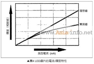 發(fā)光層的溫升 LED芯片使用的半導(dǎo)體材料,假如溫度上升發(fā)光效率會下降。圖4是一般發(fā)光二極管的施加電流與輝度的關(guān)系,由圖可知實(shí)際LED芯片若與理想特性比較,高電流領(lǐng)域的輝度明顯降低,主要原因施加電力會造成發(fā)光層的溫度上升,內(nèi)部量子效率則明顯降低。