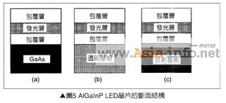 光吸收 圖5是AlGaInP LED芯片的斷面結(jié)構(gòu)。AlGaInP是在格子整合的GaAs單結(jié)晶基板表面,利用金屬有機(jī)物化學(xué)氣相沉積(MOCVD)技術(shù)制作磊晶。由于GaAs基板對可視光呈不透明狀,因此一般泛用AlGaInP LED芯片的斷面結(jié)構(gòu),如圖5(a)所示,朝發(fā)光層下方的光線會被GaAs基板吸收。