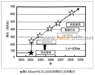 圖6是AlGaInP紅光LED的高輝度化技術(shù)動向,如圖所示從傳統(tǒng)光線吸收基板進(jìn)化到透明基板,加上業(yè)者已經(jīng)針對LED基板,進(jìn)行上述三大技術(shù)改善,其結(jié)果使得LED的輝度3年大約進(jìn)步2倍,08年全球最高發(fā)光效率80lm/W的AlGaInP LED也因而正式商品化。上述高輝度AlGaInP LED的輝度是傳統(tǒng)使用吸收基板AlGaInP系LED的10倍,今后可看在液晶背光照明模塊車燈、照明、信號燈、植物培育等領(lǐng)域拓展市場規(guī)模。