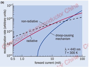 圖1b.非輻射機(jī)制在低驅(qū)動(dòng)電流時(shí)占主導(dǎo)地位,隨著電流增加讓位于輻射復(fù)合,之后效率反而下降。
