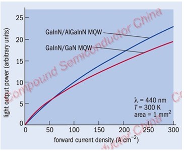 功率下降具體來說是指藍(lán)光、綠光和在電流增大時(shí)效率反而下降的現(xiàn)象。GaN基LED通常僅在電流密度10A cm-2時(shí)效率達(dá)到峰值,電流密度為100A cm-2時(shí)效率降為峰值的一半。這引起了大家的關(guān)注,當(dāng)今的高亮度芯片都需要在比10A cm-2大得多的電流密度下高效地工作。