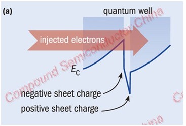 在傳統(tǒng)的藍(lán)光LED中,GaN勢(shì)壘圍繞在GaInN量子阱的兩側(cè),勢(shì)阱的n型區(qū)一側(cè)表面電荷為負(fù)。這些電荷會(huì)排斥電子,并阻礙電子注進(jìn)。勢(shì)阱的p型區(qū)一側(cè)表面電荷為正,會(huì)吸收電子,增加電子逃逸的可能性(圖a)。