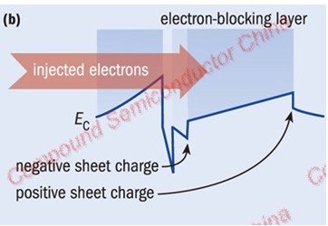 AlGaN電子阻擋層具有相反的效果。它們會(huì)在n型區(qū)一側(cè)產(chǎn)生正電荷,使得電子更輕易跨越勢(shì)壘(圖b)。通過進(jìn)步Al組分來增加電子阻擋層的帶隙寬度并不是一個(gè)很好的解決辦法,原因是表面電荷也會(huì)同時(shí)增加。