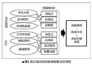 如上所述汽車、照明與一般民生業(yè)者已經(jīng)開(kāi)始積極檢討LED的適用性(圖3),一般民生業(yè)者對(duì)高功率LED期待的特性分別是省電、高輝度、長(zhǎng)使用壽命、高色再現(xiàn)性,這意味著高散熱性是高功率LED封裝基板不可欠缺的條件。