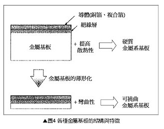 金屬系高散熱基板又分成硬質(zhì)(rigid)與可撓曲(flexible)系基板兩種(圖4) ,硬質(zhì)系基板屬于傳統(tǒng)金屬基板,金屬基材的厚度通常大于1mm,硬質(zhì)系基板廣泛應(yīng)用在模塊與照明模塊,技術(shù)上它是與鋁質(zhì)基板同等級(jí)高熱傳導(dǎo)化的延伸,未來(lái)可看應(yīng)用在高功率LED的封裝。