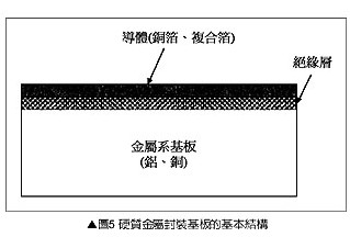 圖5是硬質(zhì)金屬系封裝基板的基本結(jié)構(gòu),它是利用傳統(tǒng)樹(shù)脂基板或是陶瓷基板,賦寧波信息網(wǎng)予高熱傳導(dǎo)性、加工性、電磁波遮蔽性、耐熱沖擊性等金屬特性,構(gòu)成新世代高功率LED封裝基板。