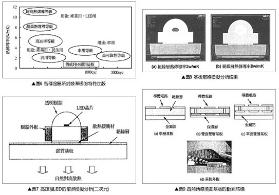 圖6是各種金屬系封裝基板的特性比較,一般而言金屬封裝基板的等價(jià)熱傳導(dǎo)率標(biāo)準(zhǔn)大約是2W/m?K,為滿足客戶4~6W/m?K高功率化的需要,業(yè)者已經(jīng)推出等價(jià)熱傳導(dǎo)率超過(guò)8W/m?K的金屬系封裝基板。