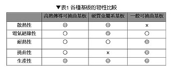 可撓曲基板的主要用途大多集中在布線用基板,以往高功率晶體管與IC等高發(fā)熱組件幾乎不使用可撓曲基板,最近幾年液晶顯示器為滿足高輝度化需求,強(qiáng)烈要求可撓曲基板可以高密度設(shè)置高功率LED,然而LED的發(fā)熱造成LED使用壽命降低,卻成為非常棘手的技術(shù)課題,固然利用鋁板質(zhì)補(bǔ)強(qiáng)板可以進(jìn)步散熱性,不過(guò)卻有本錢(qián)與組裝性的限制,無(wú)法根本解決題目。