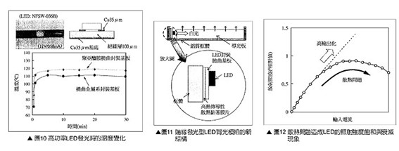 由圖8可知使用高熱傳導(dǎo)性盡緣層封裝基板,可以大幅降低LED芯片的溫度。此外基板的散熱設(shè)計(jì),透過(guò)散熱膜片與封裝基板的組合,還可看延長(zhǎng)LED芯片的使用壽命。