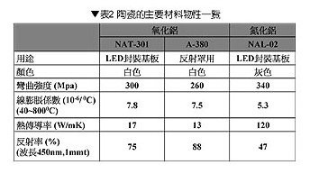 表2是陶瓷的主要材料物性一覽,除此之外陶瓷耐熱性與耐光線劣化性也比樹(shù)脂優(yōu)秀。