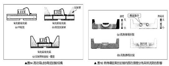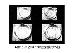 圖13是高功率LED陶瓷封裝的外觀;圖14是高功率LED陶瓷封裝的基本結(jié)構(gòu),圖14(b)的反射罩電鍍銀膜。它可以進(jìn)步光照射率,圖14(c)的陶瓷反射罩則與陶瓷基板呈一體結(jié)構(gòu)。