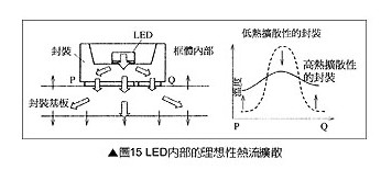 圖15表示LED內(nèi)部理想性熱流擴(kuò)散模式,圖15右圖的實(shí)線表示封裝內(nèi)部P~Q之間高熱流擴(kuò)散分布非常平坦,由于熱流擴(kuò)散至封裝整體均勻流至封裝基板,其結(jié)果使得LED芯片正下方的溫度大幅降低。