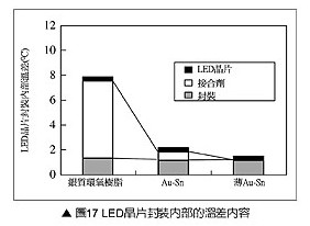圖17是熱傳導(dǎo)差異對(duì)封裝內(nèi)部的溫度分布,與熱流束特性的模擬分析結(jié)果,封裝基板使用氮化鋁。根據(jù)仿真分析結(jié)果顯示LED接合部的溫差,熱傳導(dǎo)性非常優(yōu)秀的Au-Sn比低散熱性銀充填環(huán)氧樹(shù)脂接合劑更優(yōu)秀。