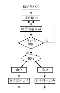 該部分軟件的功能是完成對接收數(shù)據(jù)的識別、存儲、變換和顯示驅(qū)動,并可實現(xiàn)本地本機的自檢,顯示固化圖像。當(dāng)接收裝置的譯碼芯片有輸出時,單片機就中斷當(dāng)前的顯示,接收標(biāo)志字,然后判斷此標(biāo)志字的內(nèi)容,確定將接收的是圖像點陣,還是操作控制命令。若是點陣數(shù)據(jù),就將其連續(xù)接收存放到一個顯示緩沖數(shù)據(jù)庫中,按當(dāng)前的方式顯示。若是命令,則立刻改變顯示方式。