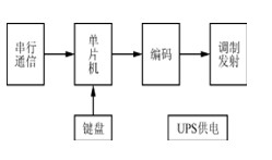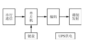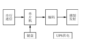 發(fā)射機由單片機、鍵盤、編碼器、發(fā)射器、串行通信接口和UPS供電系統(tǒng)組成,其結(jié)構(gòu)框圖如圖3所示。