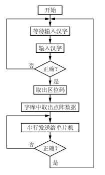設(shè)終端顯示屏所顯示的是16×16的漢字點陣。所以,要想在終端上顯示廣告信息,必須將該信息所包含的漢字的點陣數(shù)據(jù)傳到終端上。在TURBOC3.0中,將漢字賦值給一個變量時,實際上是將該漢字的區(qū)位碼賦值給這個變量。每個漢字都是16×16的點陣,筆劃經(jīng)過的地方為“1”,其余為“0”。這樣,按從上到下,從左到右的順序,一個漢字由256個點組成,也就是32個字節(jié)。漢字按區(qū)位碼的順序排列在漢字字庫中,區(qū)碼為行,位碼為列,一區(qū)有94位。這樣,某漢字在漢字庫中的偏移地址為(區(qū)碼×94+位碼)×32.取出后的32字節(jié)漢字點陣,經(jīng)由PC機的串行口送入到發(fā)射機中。其流程如圖5所示。