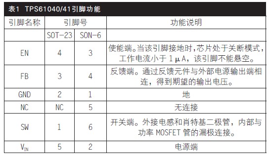 TPS61040/41采用SOT-23-5或SON-6封裝如圖1所示,其引腳功能如表1所示。