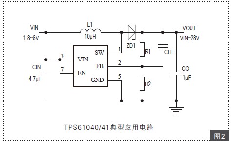 圖1 TPS61040/41采用SOT-23-5或SON-6封裝