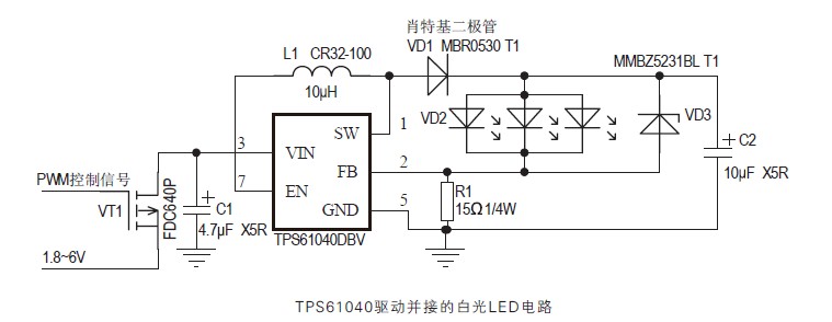 圖3 TPS61040驅動并接的白光LED電路