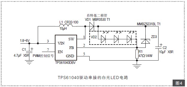 圖4 TPS61040驅動串接的白光LED電路