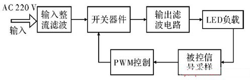 圖1 PWM 方式開(kāi)關(guān)電路設(shè)計(jì)的LED 驅(qū)動(dòng)電路框圖