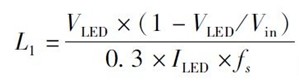 電感L1取值與LED 電流的紋波值有關(guān),一般限制紋波系數(shù)最大為0. 3,電感值的計(jì)算公式為: