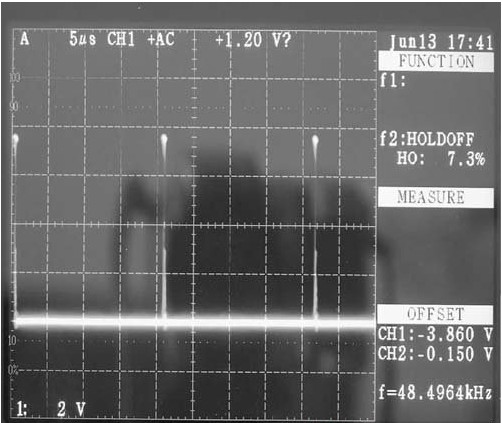 對(duì)所設(shè)計(jì)的PWM 開(kāi)關(guān)驅(qū)動(dòng)電路進(jìn)行電路搭建,并采用數(shù)字電壓表,交流功率計(jì),示波器等實(shí)驗(yàn)儀器對(duì)其實(shí)物電路的工作狀態(tài)進(jìn)行了測(cè)試。在電路正常工作情況下,對(duì)電路中的2 個(gè)關(guān)鍵點(diǎn)的電壓波形進(jìn)行測(cè)試。