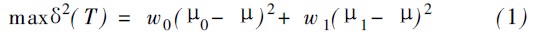 式中T 表示分割閾值, w 0、w 1 分別表示灰度值小于T、大于T 的像素點(diǎn)在圖像中所占的比重, 、“0”、“1” 分別表示圖像整體的灰度平均值、灰度值小于T 的那部分圖像的灰度平均值、灰度值大于T 的那部分圖像的灰度平均值。