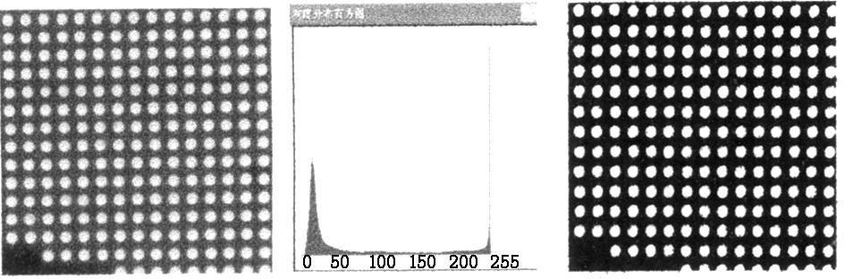 由于LED 顯示屏的點(diǎn)陣特性, 實(shí)際檢測(cè)中發(fā)現(xiàn)采集的圖寧波婚慶網(wǎng)像( 如圖2( a) 其灰度直方圖( 如圖2( b) ) 雙峰分布特征十分明顯。對(duì)于這類情況, 采用式( 1) 的最大方差閾值法來(lái)自動(dòng)選擇分割閾值, 不僅效果好, 而且速度快。