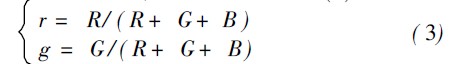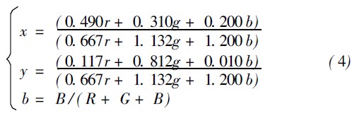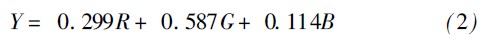 借鑒成功用于PAL( Phase Alternating Line, 逐行倒相制) 制式的電視系統(tǒng)中的YUV 顏色模型( Y 表示亮度, U 和V 是構(gòu)成彩色的兩個(gè)分量) , 筆者將圖像中采用的RGB 顏色模型轉(zhuǎn)換成式( 2) 的顏色模型, 可以方便、快捷地計(jì)算出各像素點(diǎn)的相對(duì)亮度值。