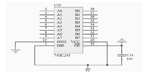 FPGA采用的電壓是3.3V,而LED屏體顯示電路的電壓是5V的TTL邏輯電平,因此需要進(jìn)行電平轉(zhuǎn)換的電路。這個(gè)電路由74HC245構(gòu)成,工作電壓為5V,74HC245采用CMOS工藝,是一種三態(tài)輸出、8組總線收發(fā)器,其輸入電平兼容3.3V系統(tǒng),使用外接的5V電源將輸出電平提升到5V,同時(shí)為各種控制和數(shù)據(jù)信號(hào)提供驅(qū)動(dòng)能力。74HC245的電路如圖4所示。其中:OE為輸出控制引腳,低電平為有效;DIR引腳用于控制轉(zhuǎn)換方向,接高電平時(shí)表示從A向B轉(zhuǎn)換,A0~A7用于輸入數(shù)據(jù)信號(hào),B0~B7用于輸出轉(zhuǎn)換后的數(shù)據(jù)信號(hào)。