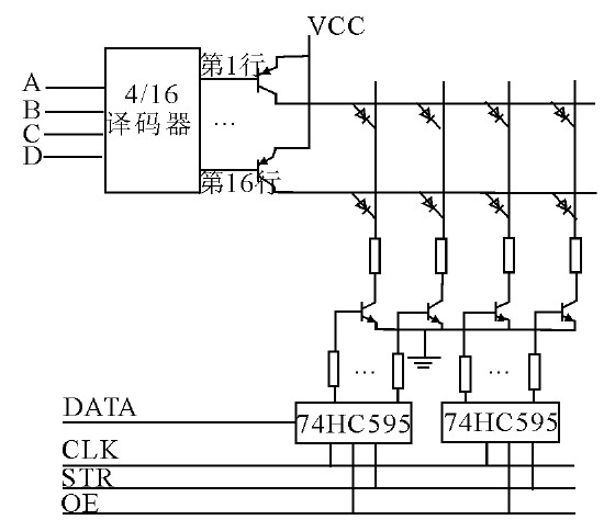 LED顯示板的面積很大,它的正面由LED 顯示塊級(jí)聯(lián)而成,背面是驅(qū)動(dòng)電路。由于LED的驅(qū)動(dòng)電流相對(duì)較大,驅(qū)動(dòng)電路應(yīng)盡量和LED點(diǎn)陣模塊靠近。因此行列驅(qū)動(dòng)器一般都安裝在屏體的背面。LED顯示板的驅(qū)動(dòng)電路中采用了74HC595芯片,是硅結(jié)構(gòu)的CMOS器件,兼容低電壓TTL電路,具有8位串入并出的移位、并行鎖存和三態(tài)輸出功能。移位寄存器和鎖存器使用獨(dú)立的時(shí)鐘,數(shù)據(jù)SDATA 在SCLK的上升沿輸入移位寄存器,在LT的上升沿進(jìn)入的鎖存器中去。當(dāng)使能信號(hào)OE為低電平時(shí),鎖存器的數(shù)據(jù)輸出到LED.74HC595芯片可以解決數(shù)據(jù)顯示和數(shù)據(jù)串行傳輸在時(shí)間上的沖突問題,在顯示1行各列數(shù)據(jù)的同時(shí),可以準(zhǔn)備下1列的LED數(shù)據(jù)。以1/16行掃描為例,LED顯示板的驅(qū)動(dòng)電路如圖5所示。
