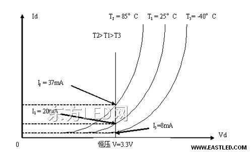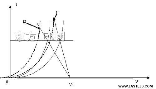 在常溫下是可以的,但在溫升以后就不能保持了。圖6中就顯示了這個標題,常溫下的LED伏安特征以實線表現(xiàn),兩個LED的伏安特征在斜率上略有差別,在用恒壓電源Vo供電時,選用不同的電阻,可以得到同樣的正向電流Io。但是當溫度升高時,其伏安特征左移,如虛線所示。由于還是本來的恒壓和本來的電阻,此時的電流卻變成了I1和I2。不即是本來的Io了。