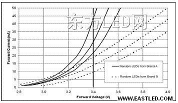圖5. 不同廠家和同一廠家生產(chǎn)的LED伏安特征的離散性