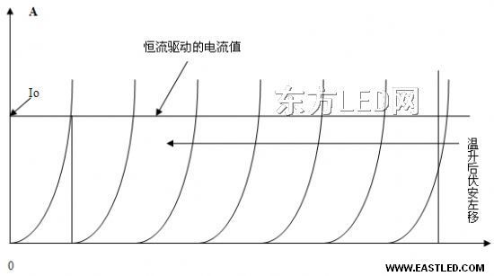 圖6. 多個LED串聯(lián),相當于多個伏安特征在恒流點疊接,加電以后溫度上升,所有伏安特征左移。